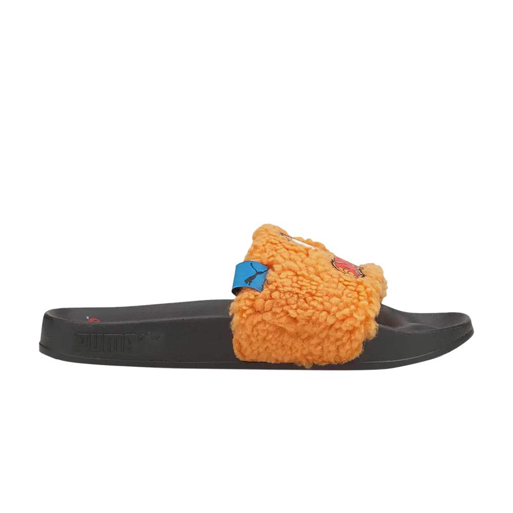 Слайд Big Kid Garfield x PUMA Leadcat 2.0 «Hungry Garfield» отдает дань уважения мультяшному кошачьему, любящему лазанью. Гарфилд, сжимая в руках печатные буквы, обозначающие «PUMA», появляется на верхней части с широкими лямками, покрытой плюшевым шерпом, повторяющим внешний вид оранжевого меха персонажа. Литая стелька совместного бренда расположена на твердой черной межподошве из ЭВА, отлитой под давлением, которая обеспечивает легкую амортизацию при каждом шаге. Подошва имеет модифицированный протектор «елочкой» для надежного сцепления.