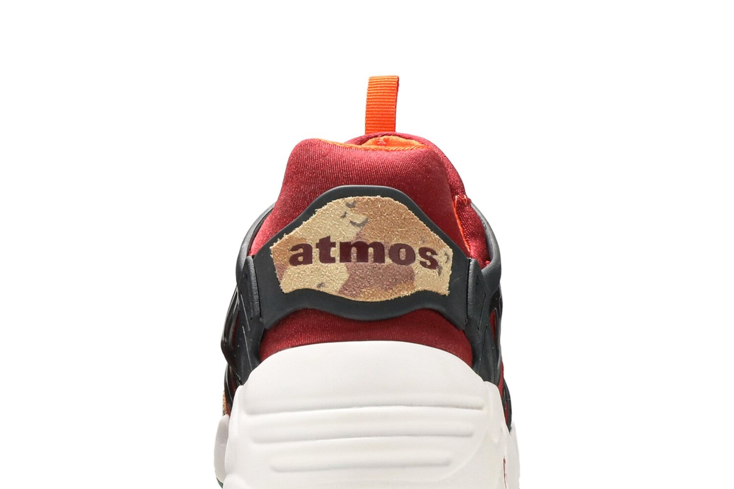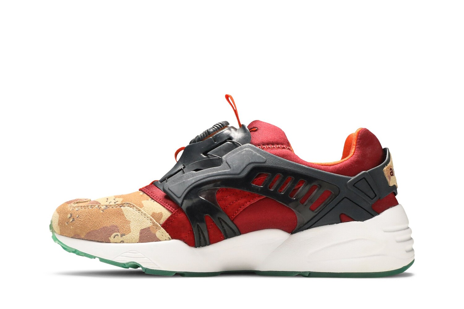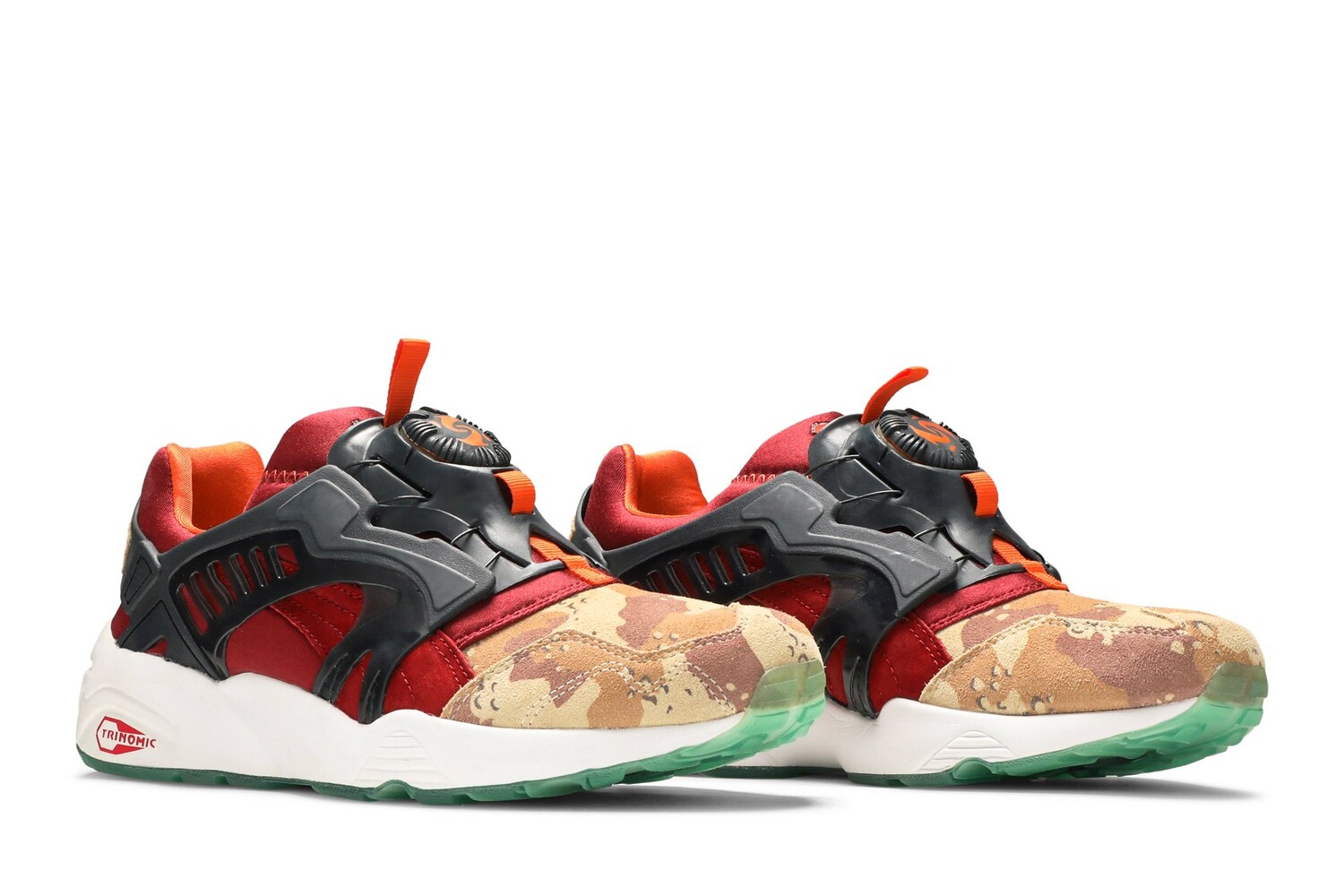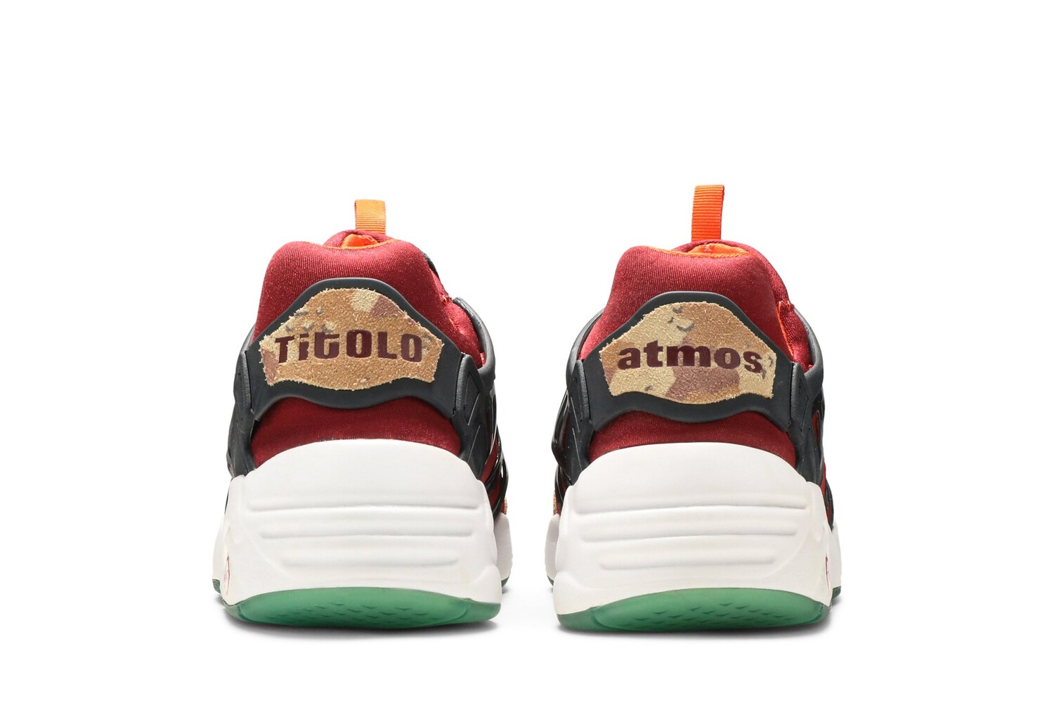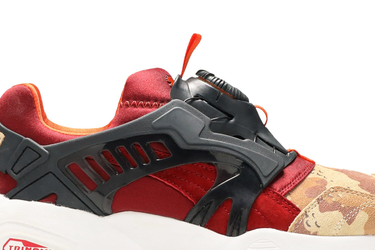В рамках сотрудничества, охватившего все континенты, швейцарский ритейлер Titolo заключил партнерство с токийским бутиком Atmos для выпуска модели Puma Disc Blaze «Desert Dusk». Яркий бегун заключает красный верх в комплекте с замшевой полоской Puma Formstripe в техническую систему шнуровки дисков. Носок и пяточный ремешок покрыты камуфляжным принтом в стиле Desert Storm, на последнем элементе нанесен фирменный логотип: надпись «Titolo» появляется на левой пятке, а Atmos — на правой. Полупрозрачная бирюзовая подошва расположена под межподошвой Trinomic.