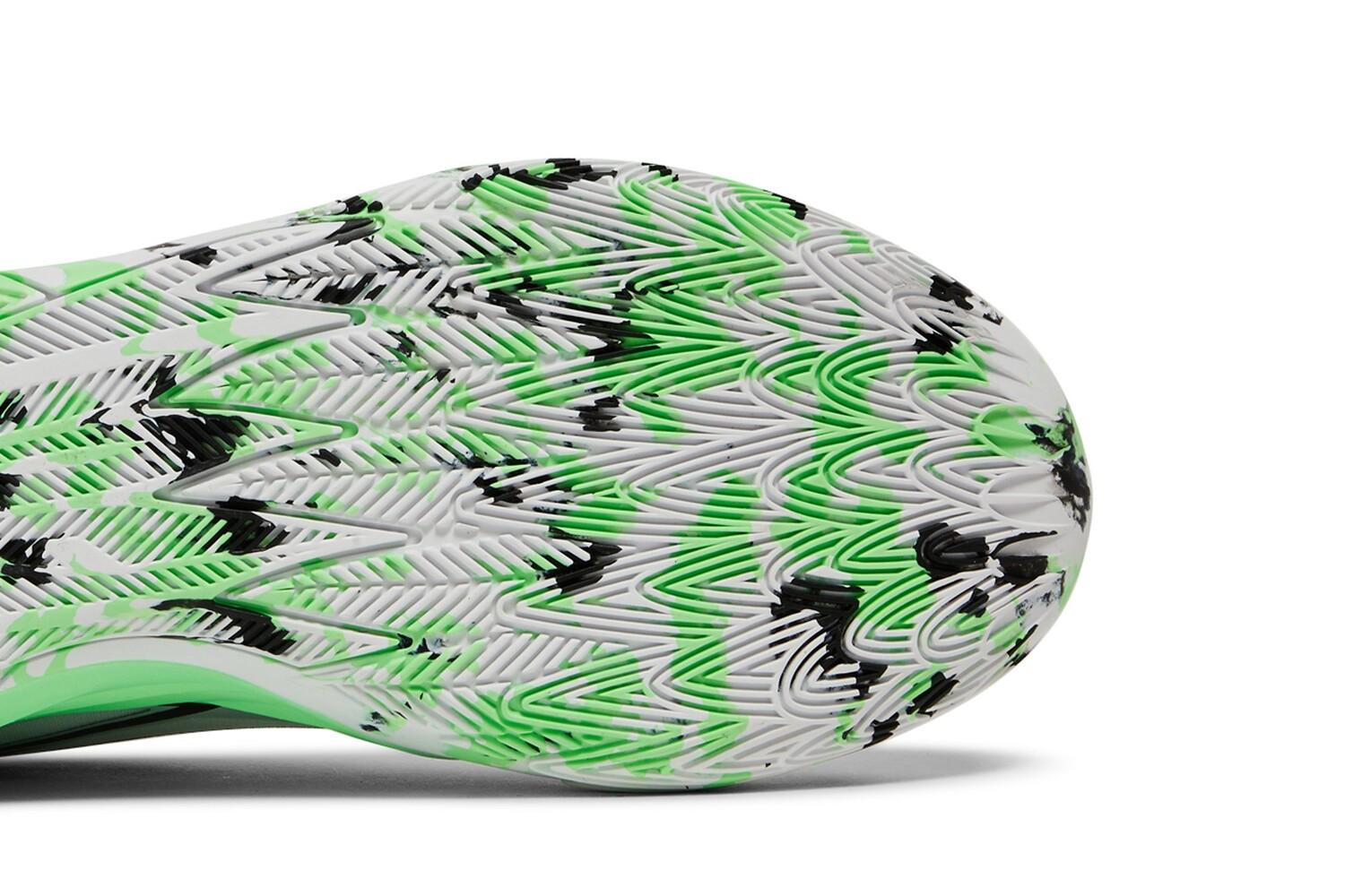 Модель PUMA MB.02 Lo «LaMel-O» получила свое название от вымышленных хлопьев для завтрака, вдохновленных звездой НБА Ламело Боллом. Кроссовки Performance Hoops имеют верх из белой инженерной сетки со светло-серыми синтетическими накладками, напоминающими фирменные крылья LaMelo. На каждом язычке несовпадающая графика изображает мультяшное изображение спортсмена на правом кроссовке и кусочек хлопья в форме буквы О на левом. Пятка из ТПУ и межподошва из пеноматериала NITRO Infused окрашены в неоново-зеленый цвет.