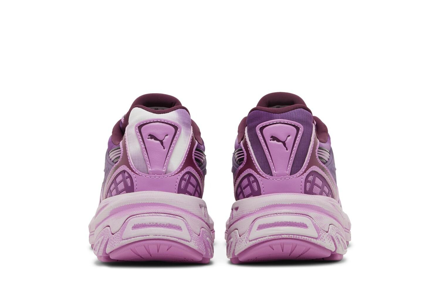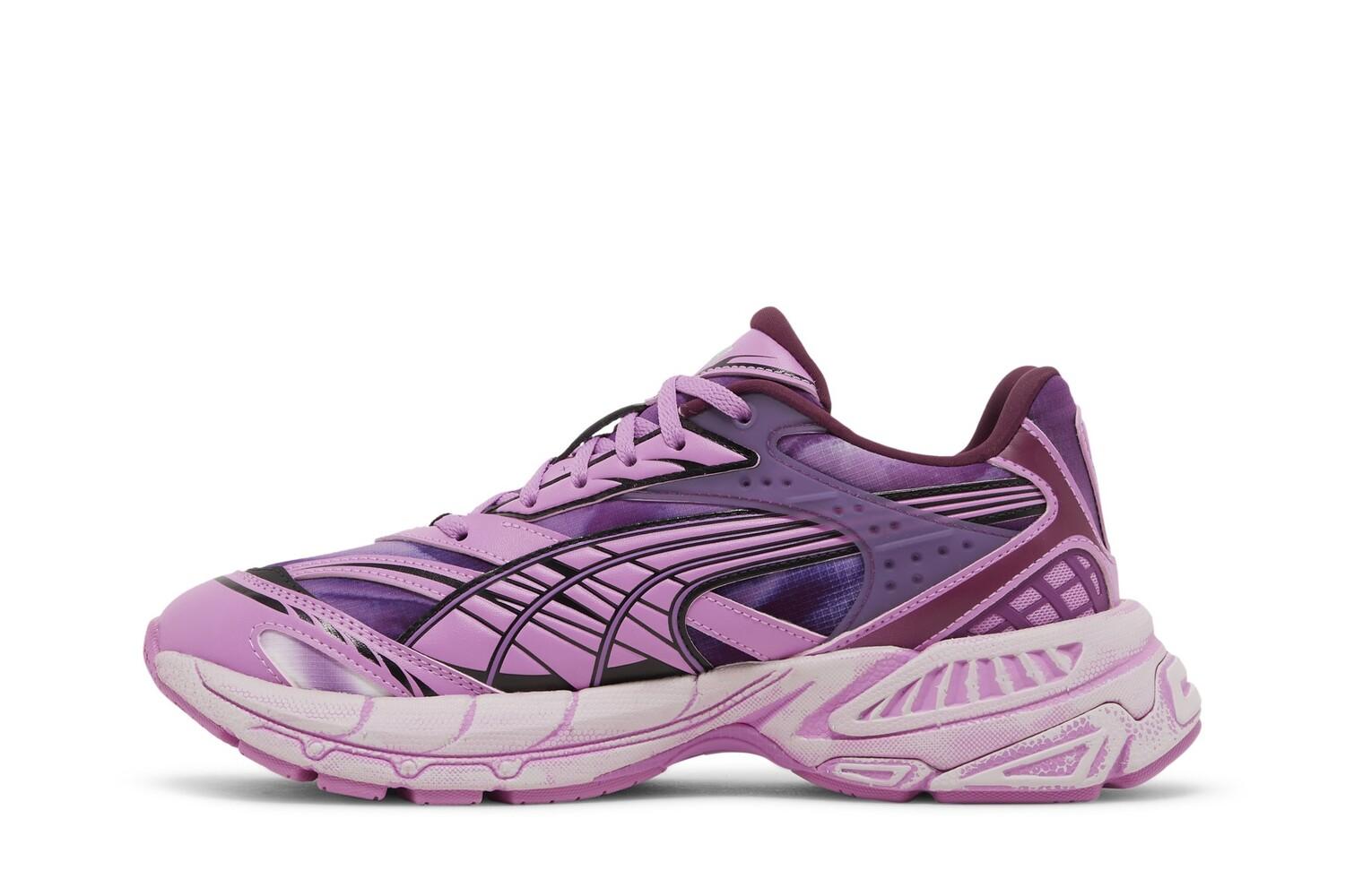Ознаменовав дебютное сотрудничество между брендами-партнерами, Pleasures x PUMA Velophasis «Overdye» представляют собой беговые кроссовки для образа жизни в привлекательной отделке. Вдохновленный смелой эстетикой 2000-х годов, массивный силуэт дополнен текстильным верхом различных оттенков фиолетового. Дышащий материал скрыт накладками из синтетической кожи розового и лилового цвета, а также фирменной полосой Formstrip, очерченной толстыми черными линиями. Фирменный знак Pleasures присутствует на держателе шнурков, а также на полупрозрачной детали из ТПУ, поддерживающей боковой воротник. Легкая амортизация обеспечивается объемной межподошвой из ЭВА, окрашенной в розовый цвет и поддерживаемой прочной резиновой подошвой.