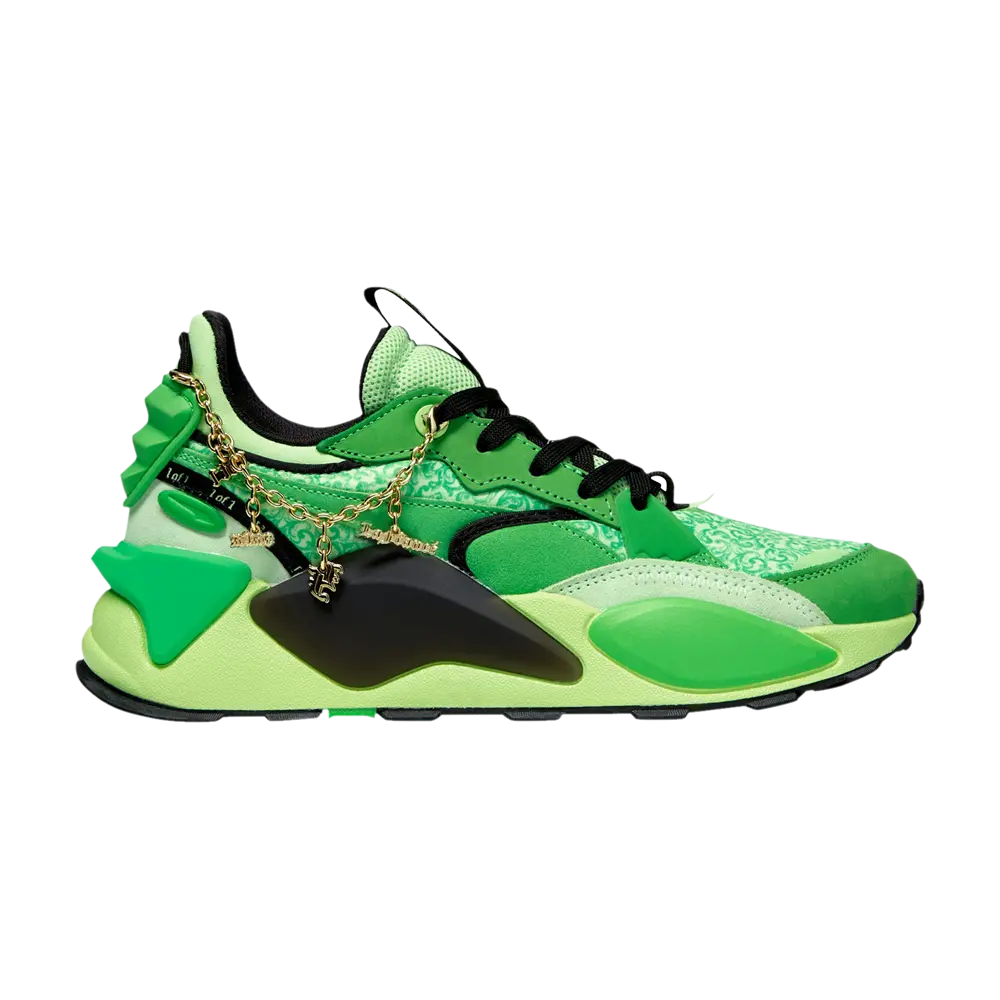 LaFrancé x PUMA RS-XL «FOREVER.RARE», выпущенная в сотрудничестве с лайфстайл-брендом LaMelo Ball, представляет собой повседневные кроссовки, созданные для ношения вне корта. Яркие зеленые тона заливают верх, который сочетает в себе накладки из нубука и двухслойную сетчатую основу, покрытую однотонным узором геральдической лилии. Черные язычки на язычке украшены логотипом LaFrancé, а декоративная металлическая золотая цепочка украшена подвесками «1 из 1», «LF» и «Rare». Угловатые детали из ТПУ встроены в легкую межподошву из пеноматериала NITROFOAM, поддерживаемую прочной нескользящей резиновой подошвой.