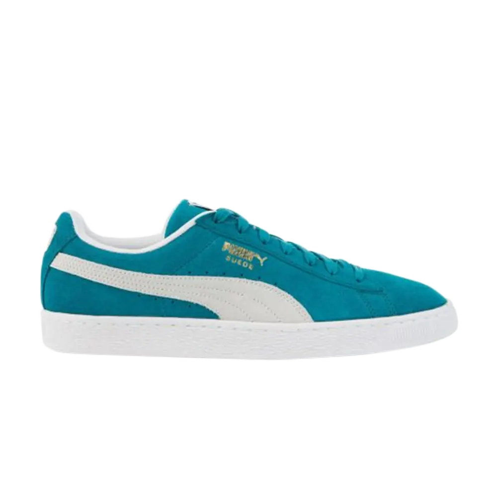 Уличные модели Puma Suede, дебютировавшие в 1968 году, известны своим сдержанным и сдержанным внешним видом. Модель Suede Classic Oceans Depth добавляет аква-синий цвет к классическому замшевому верху с перфорацией в средней части стопы, логотипом из серебряной фольги и контрастной белой полоской, обеспечивающей детализацию. Брендинг также нанесен на язычок и пятку, а резиновая межподошва и подошва завершают нижнюю часть.