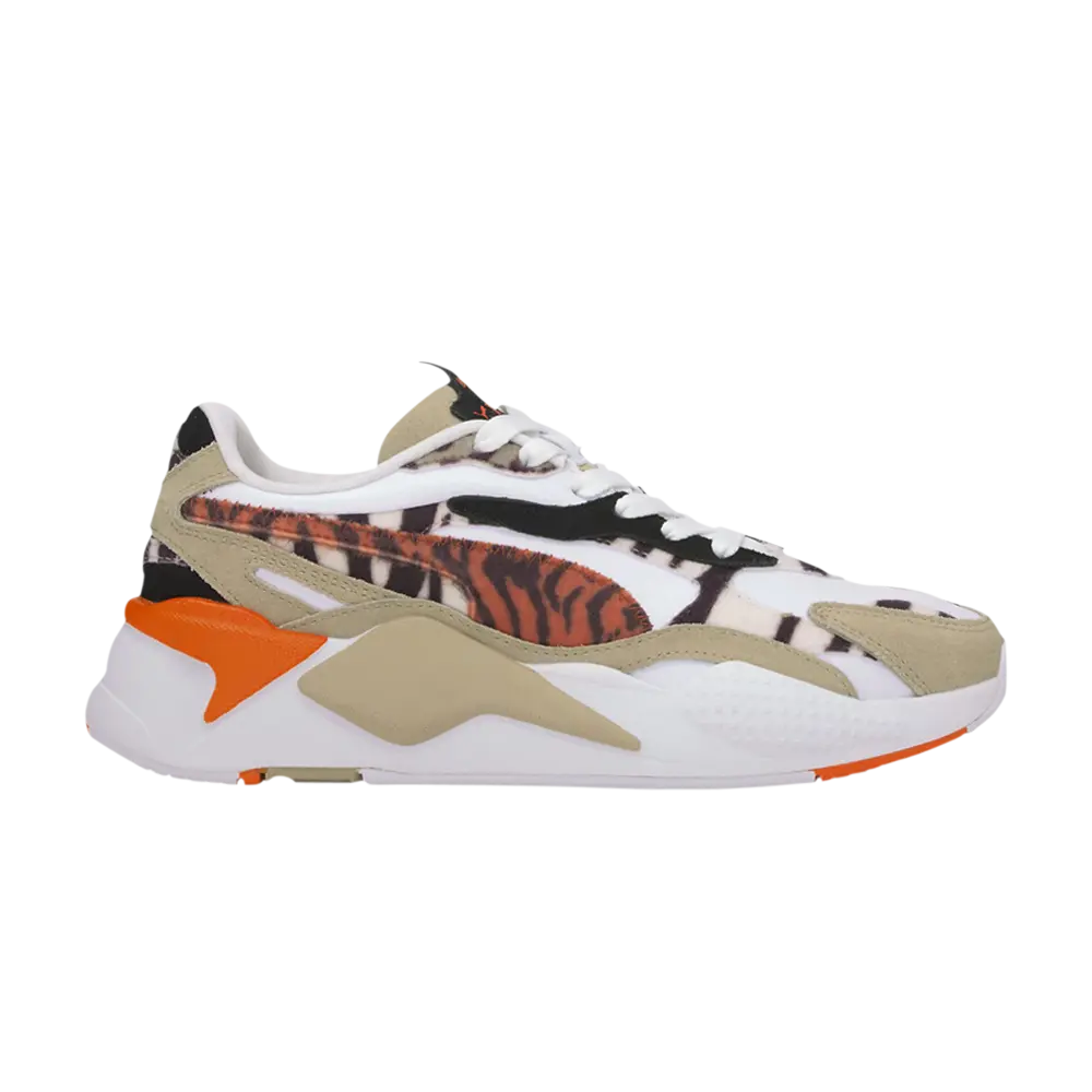 Женские кроссовки PUMA RS-X3 Pale Khaki White, выпущенные в рамках коллекции Wildcats, сочетают в себе беговые технологии в стиле ретро и модный дизайн. Последнее воплощено в кожаном верхе, украшенном пушистыми накладками с животным принтом, включая тигровые полосы на фирменной полосе PUMA Formstrip. Легкая амортизация обеспечивается объемной межподошвой из полиуретана, а ее боковые стенки оживлены яркими деталями из ТПУ цвета хаки и оранжевого цвета.