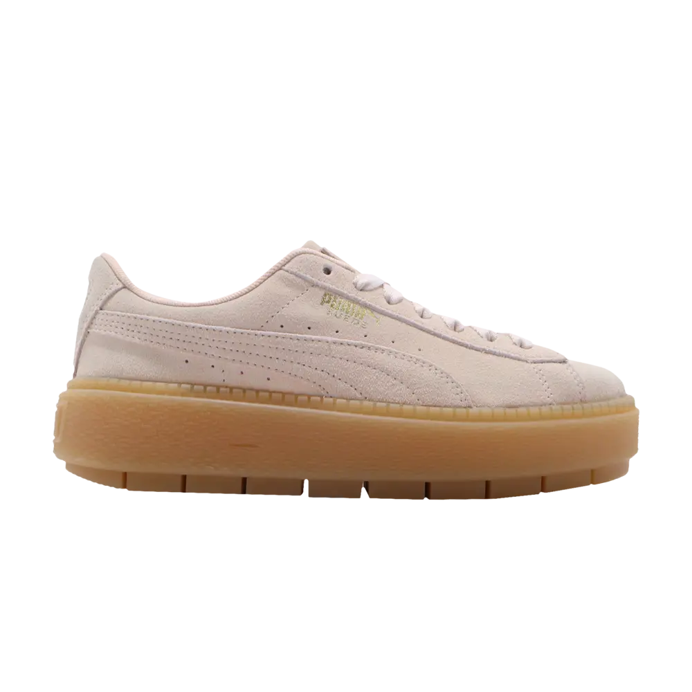 Puma Wmns Platform Trace меняет сценарий классических обручей, используя модные инструменты. Это женское издание, представленное в сентябре 2019 года, выполнено из замши Pastel Parchment с прошитыми полосками, соответствующей кружевной застежкой и графической подкладкой. Нестандартные фирменные элементы и призыв сбоку приобретают золотисто-металлическую отделку. Внизу кроссовки приподняты за счет массивной резиновой межподошвы и подошвы с шипами.