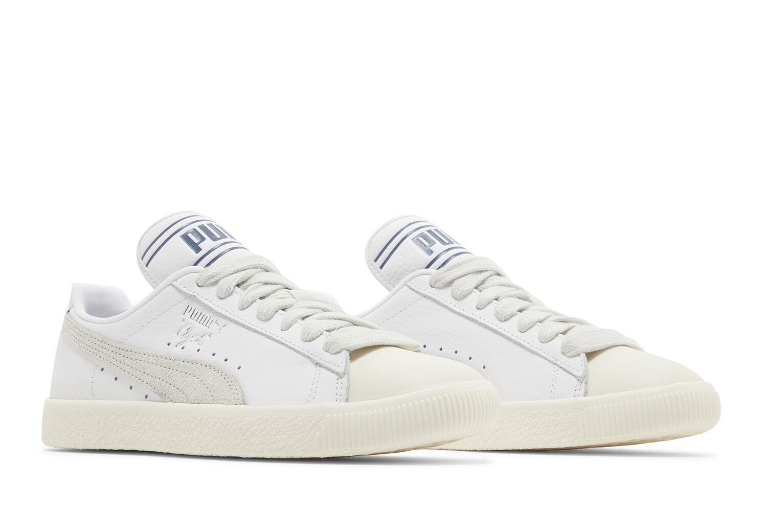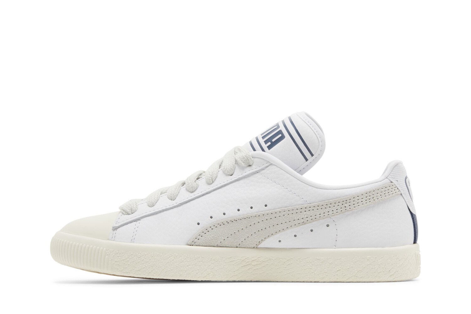 Модель Rhuigi x PUMA Clyde «Pristine» взята из совместной коллекции, посвященной Нью-Йорку. Основатель Rhude одевает классический силуэт в белоснежный кожаный верх, закрепленный широкими шнурками и украшенный фирменной полоской из бледно-серой замши. Уникальные детали включают резиновый носок цвета слоновой кости и удлиненный язычок, на котором нанесена большая надпись PUMA синими буквами. Низкий верх опирается на прочную резиновую подошву с нежной кремовой отделкой.