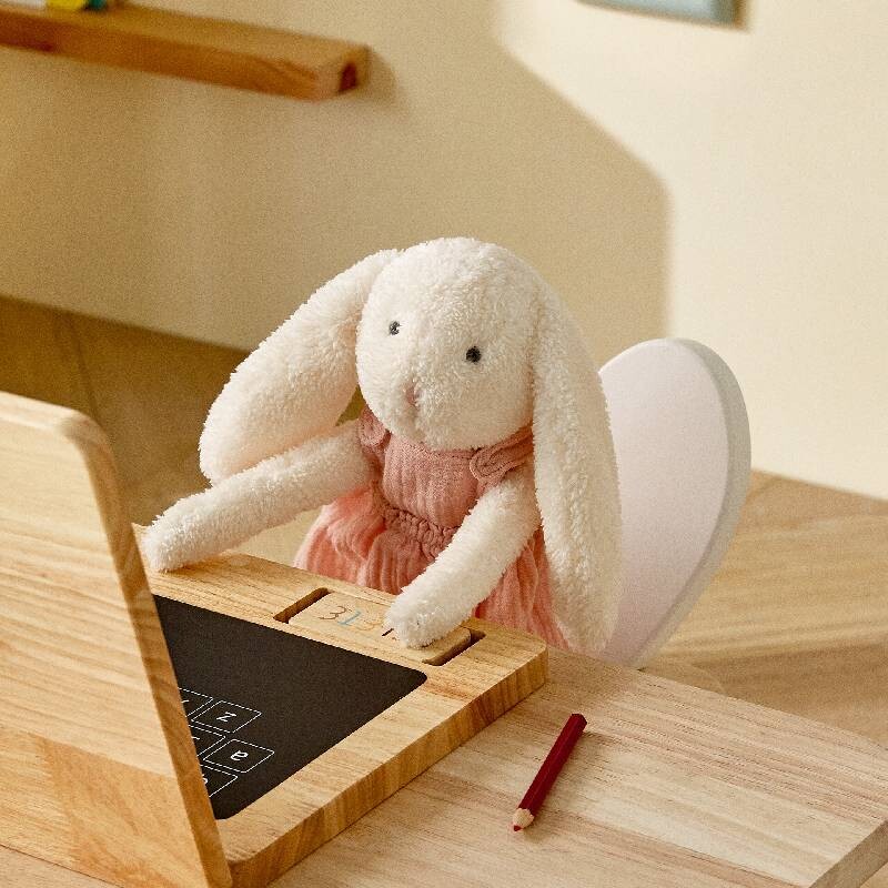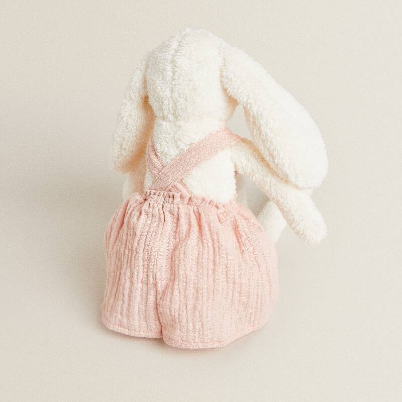 Мягкая игрушка зайка светлого цвета с контрастным платьем.