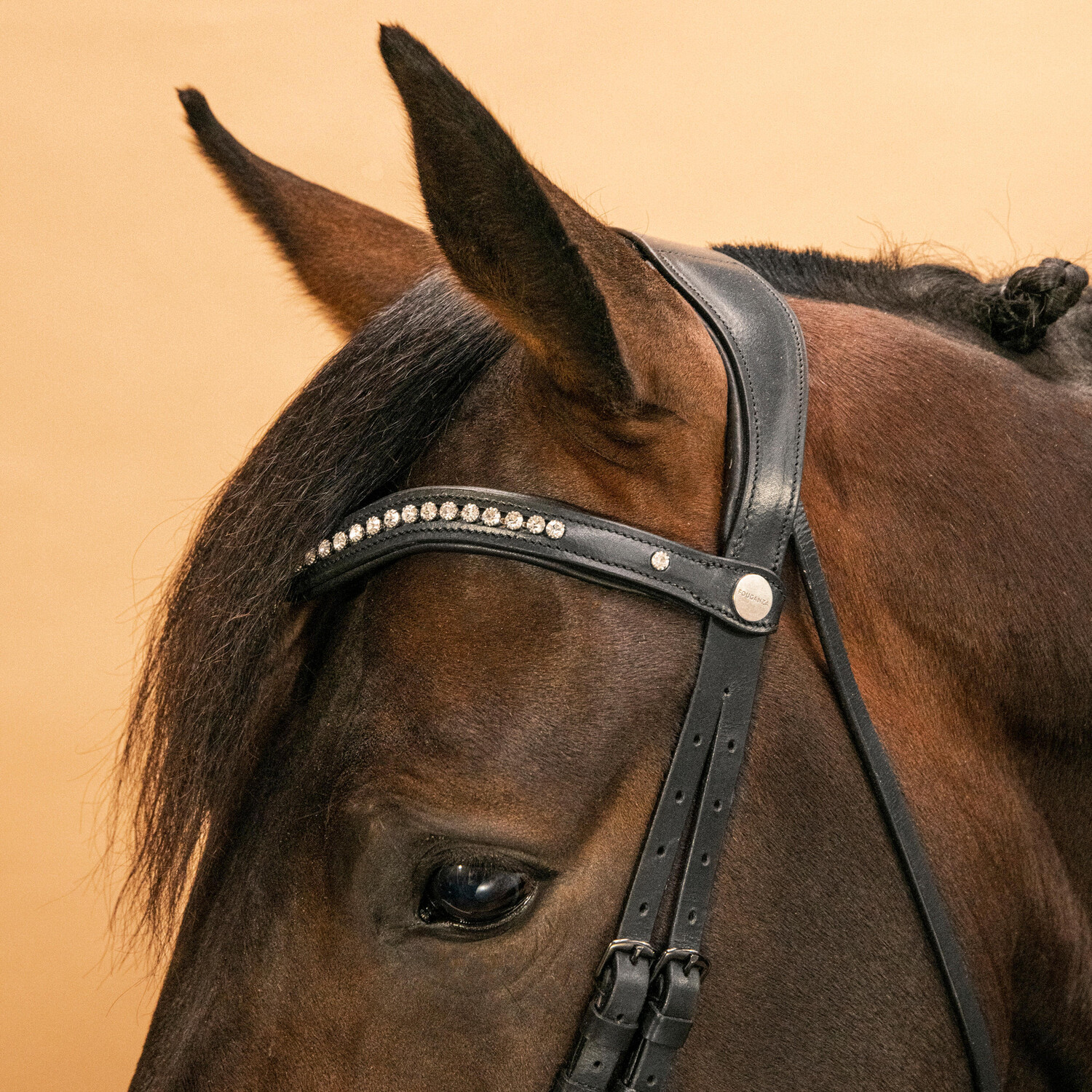 Конструкция уздечки соответствует строению головы лошади. Все элементы расположены так, чтобы не мешать лошади расслабить мышцы. Выездковая модель 900 имеет украшенную кристаллами налобную ленту и блестящую широкую носовую дужку. Все это изысканно и элегантно.