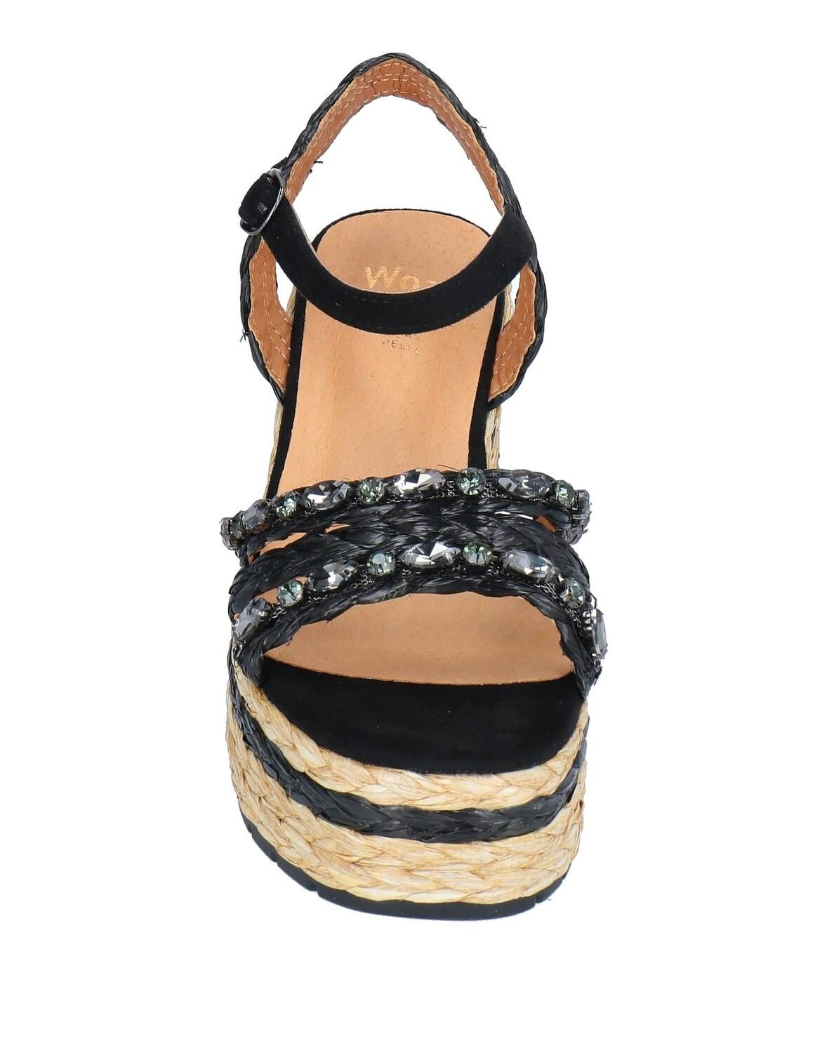 Материал рафия, синтетическое волокно, эффект замши, кристаллы, одноцветное изделие с аппликациями, подкладка из кожи, застежка-пряжка, скругленный носок, каблук-танкетка, обтянутая танкетка, резиновая подошва, содержит нетекстильные части животного происхождения.