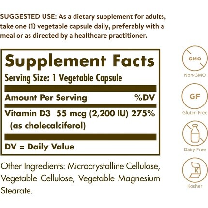 Витамин D3 2200 МЕ, растительные капсулы, 100 шт., Solgar
