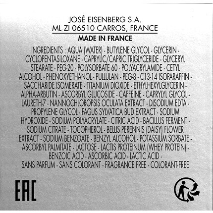 Aqua (water) - butylene glycol - glycerin - cyclopentasiloxane - caprylic/capric triglyceride - glyceryl stearate - peg-20 - polysorbate 60 - polyacrylamide - cetyl alcohol - phenoxyethanol - pullulan - peg-8 - c13-14 isoparaffin - saccharide isomerate - ci 77891 (titanium dioxide) - ethylhexylglycerin - alpha-arbutin - ascorbyl glucoside - caffeine - caprylyl glycol - laureth-7 - nannochloropsis oculata extract - disodium edta - propylene glycol - fagus sylvatica bud extract - sodium hydroxide - sodium polyacrylate - citric acid - bacillus ferment - sodium citrate - tocopherol - bellis perennis (daisy) flower extract - sodium benzoate - benzyl alcohol - potassium sorbate - ascorbyl palmitate - lactose - lactis proteinum (whey protein) - benzoic acid - ascorbic acid - disodium phosphate - lactic acid.