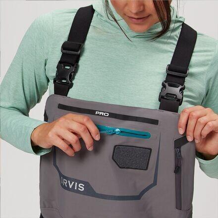Женские вейдерсы Pro — это профессиональный вариант от Orvis для рыбаков, которые занимаются рыбной ловлей профессионально или увлеченно. Прочная конструкция Cordura включает в себя 4-слойную гидроизоляцию в верхней части и более прочную 5-слойную гидроизоляцию в области ног для большей защиты при ходьбе по бедра. В комплект входят неопреновые ботинки, наколенники Ortholite, защита от гравия и множество карманов для предметов первой необходимости для рыбалки.