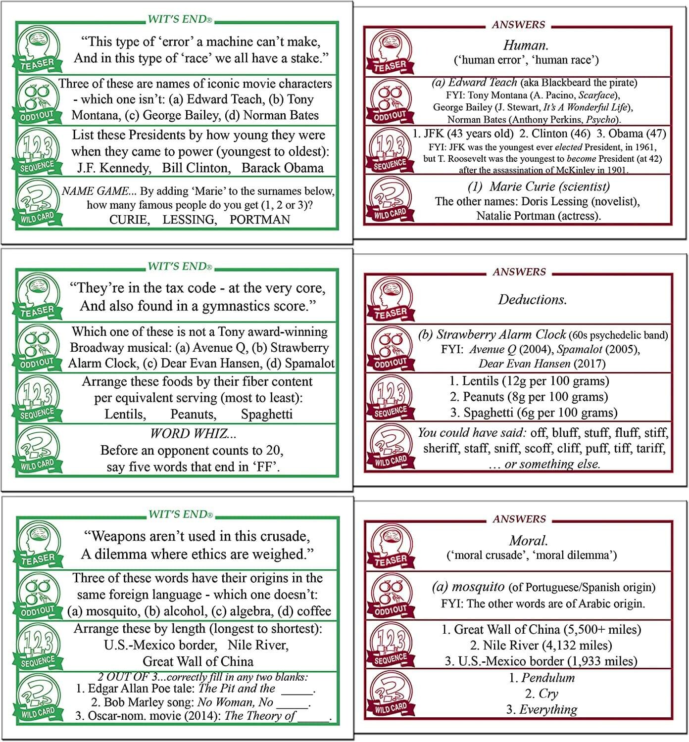 Проверьте свою эрудицию с помощью игры Wit's End! Эта сложная и увлекательная игра-викторина проверит ваши знания и заставит подумать над интересными задачами. Отвечайте на вопросы в четырех непростых категориях, продвигаясь к центру доски. Вопросы заполнены загадками и головоломками по истории, текущим событиям, популярной культуре, географии, науке, искусству и многому другому. Так что думайте на пределе своих возможностей и получайте удовольствие!