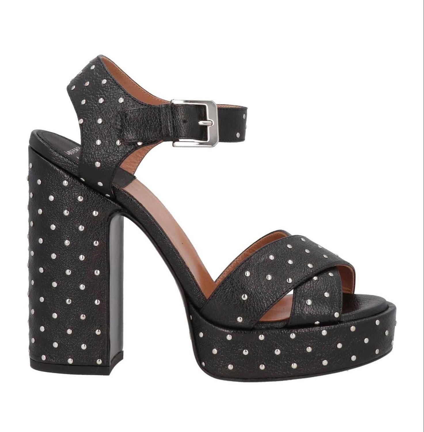Стильные босоножки из мягкой кожи, украшены металлическими круглыми заклепками. Модель с открытым мыском и задником и широким ремешком с застежками на щиколотке. Гибкая кожаная подошва дополнена устойчивым каблуком, поддерживающим стиль изделия. Высота каблука 12 см.