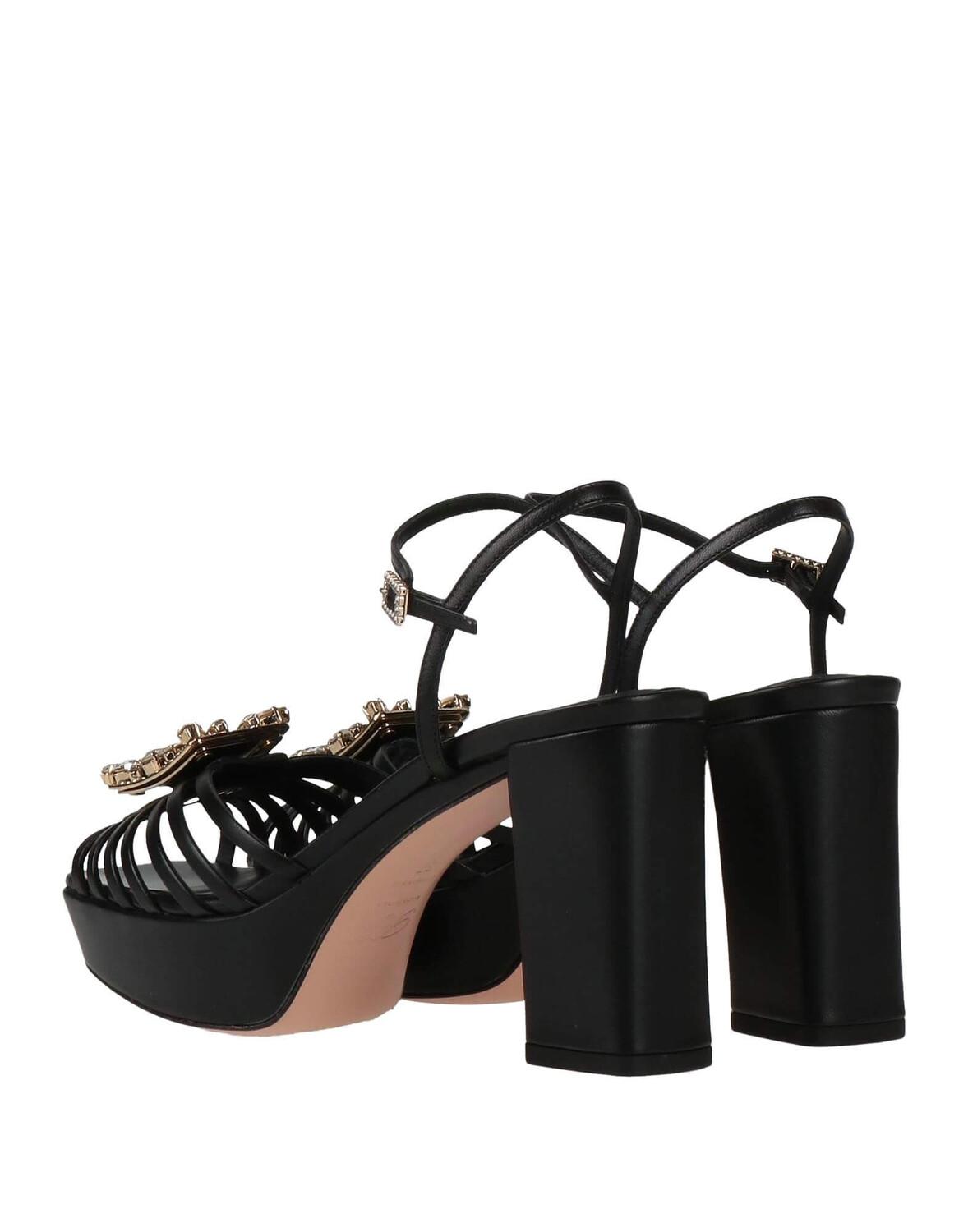 Босоножки из натуральной кожи на платформе и высоком квадратном каблуке, с квадратной линией носка, застежке на щиколотке, с пряжкой со стразами на носочной части.