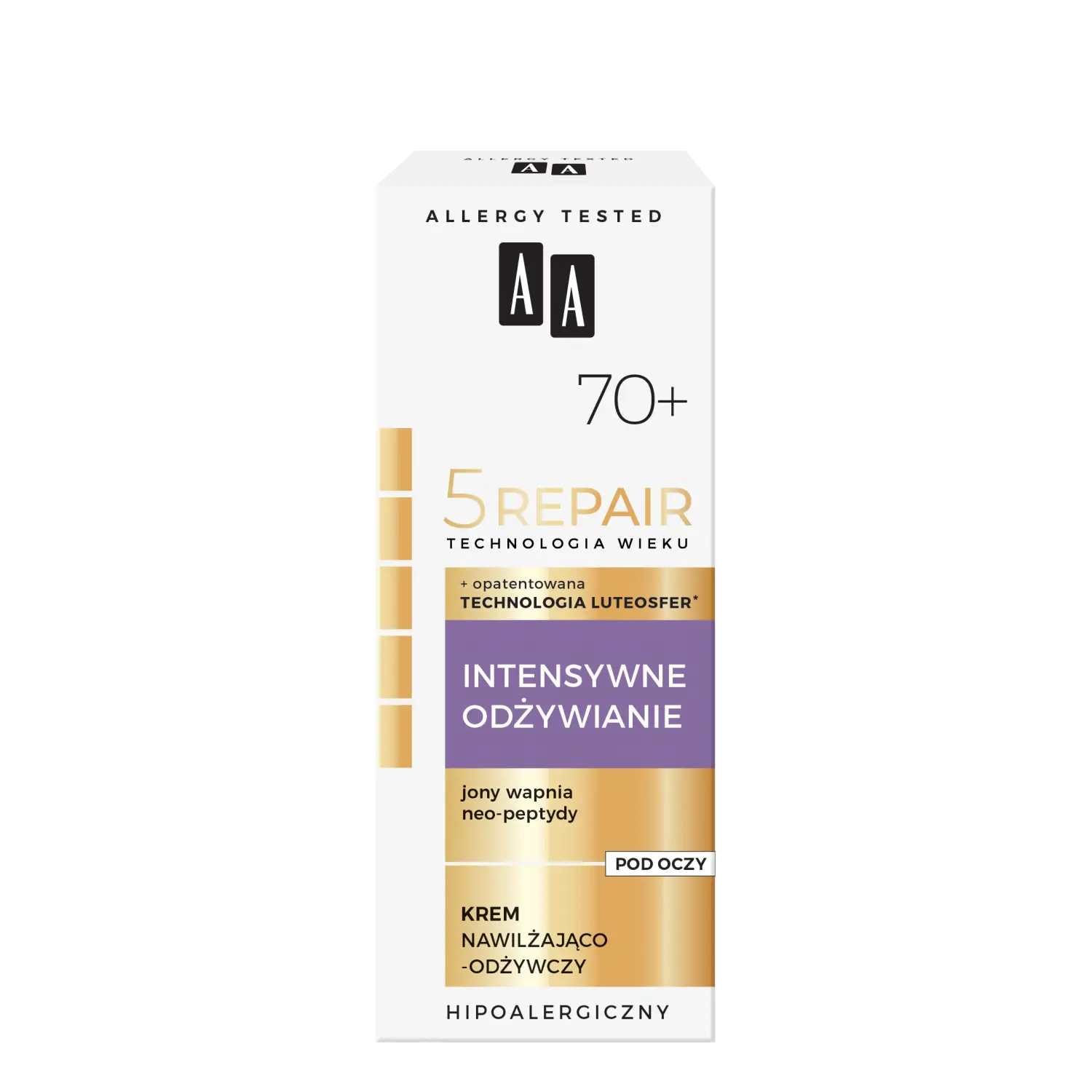 Aa technology of age 5 repair — это передовая программа ухода за зрелой кожей с доказанной эффективностью против морщин. запатентованная технология luteosfer активирует 5-этапный процесс ревитализации в соответствии с потребностями кожи старше 70 лет. лютеосферы (биосовместимые липидные микросферы) постепенно и точно выделяют в кожу активные вещества... увлажняющий и питательный крем для глаз обеспечивает впечатляющий омолаживающий эффект: улучшение напряжения, укрепление, эластичность, увлажнение и питание. гипоаллергенная формула, клинически протестированная на аллергиках, обеспечивает высочайший уровень безопасности и эффективности даже для самой чувствительной кожи. действие активных ингредиентов: нео-пептиды - омолаживают и формируют контур глаз, подтягивают кожу и эффективно разглаживают мимические морщины, предотвращая их углубление ионы кальция - комплексно укрепляют и улучшают состояние кожи, восстанавливая ее упругость, уменьшая при этом симптомы усталости .. масло жожоба – эффективно увлажняет, питает и защищает кожу от внешних факторов сквалан – регенерирует и восполняет дефицит ценных липидов в коже, предотвращая потерю воды из эпидермиса. дерматологически протестировано на людях с аллергическими заболеваниями кожи. не содержит ароматизаторов. не содержит красителей. ph нейтральный для кожи.