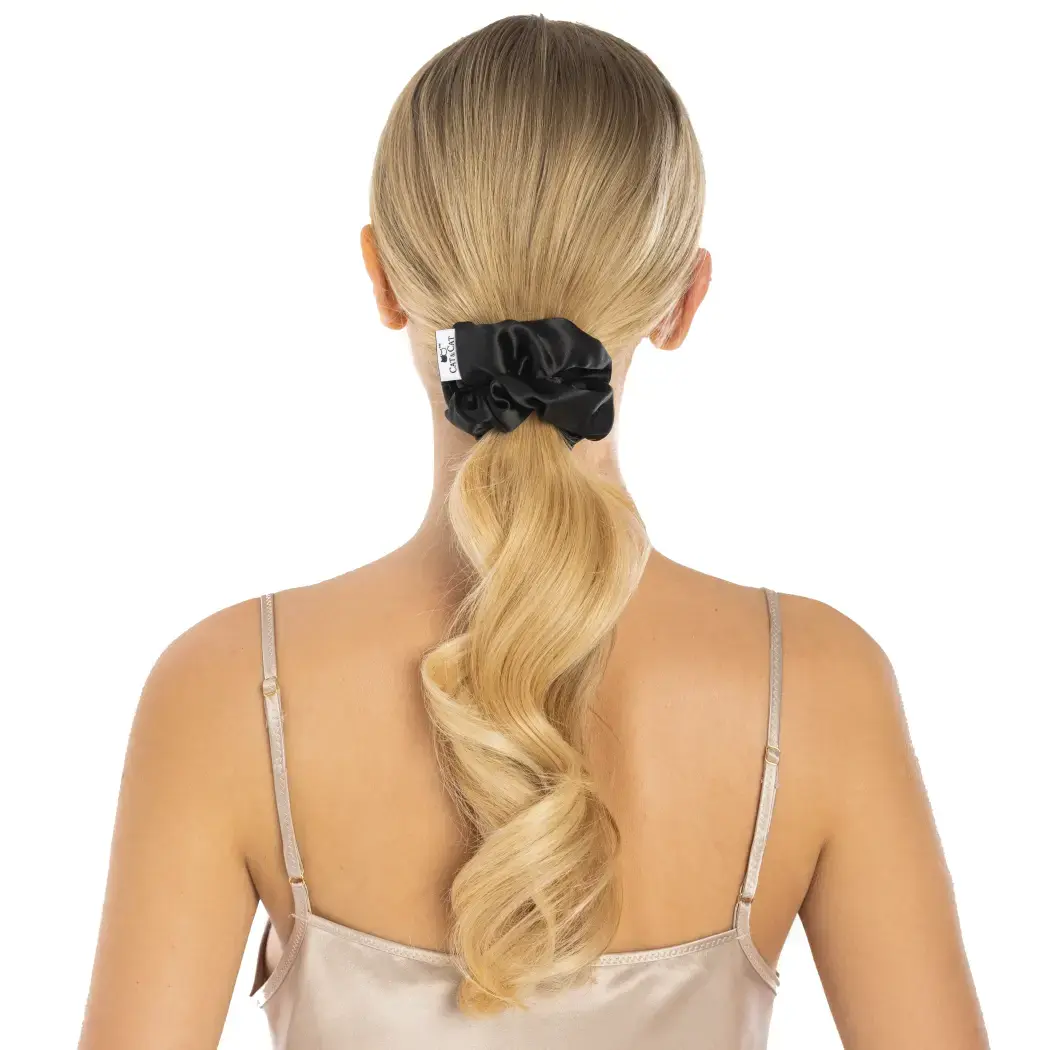 Шелковая резинка для волос черного цвета. его эксклюзивный характер подчеркнут красивым и благородным блеском шелка. резинка исключительно бережна к волосам: - не рвется и не оставляет вмятин. - не электризует волосы. - не повреждает структуру волос