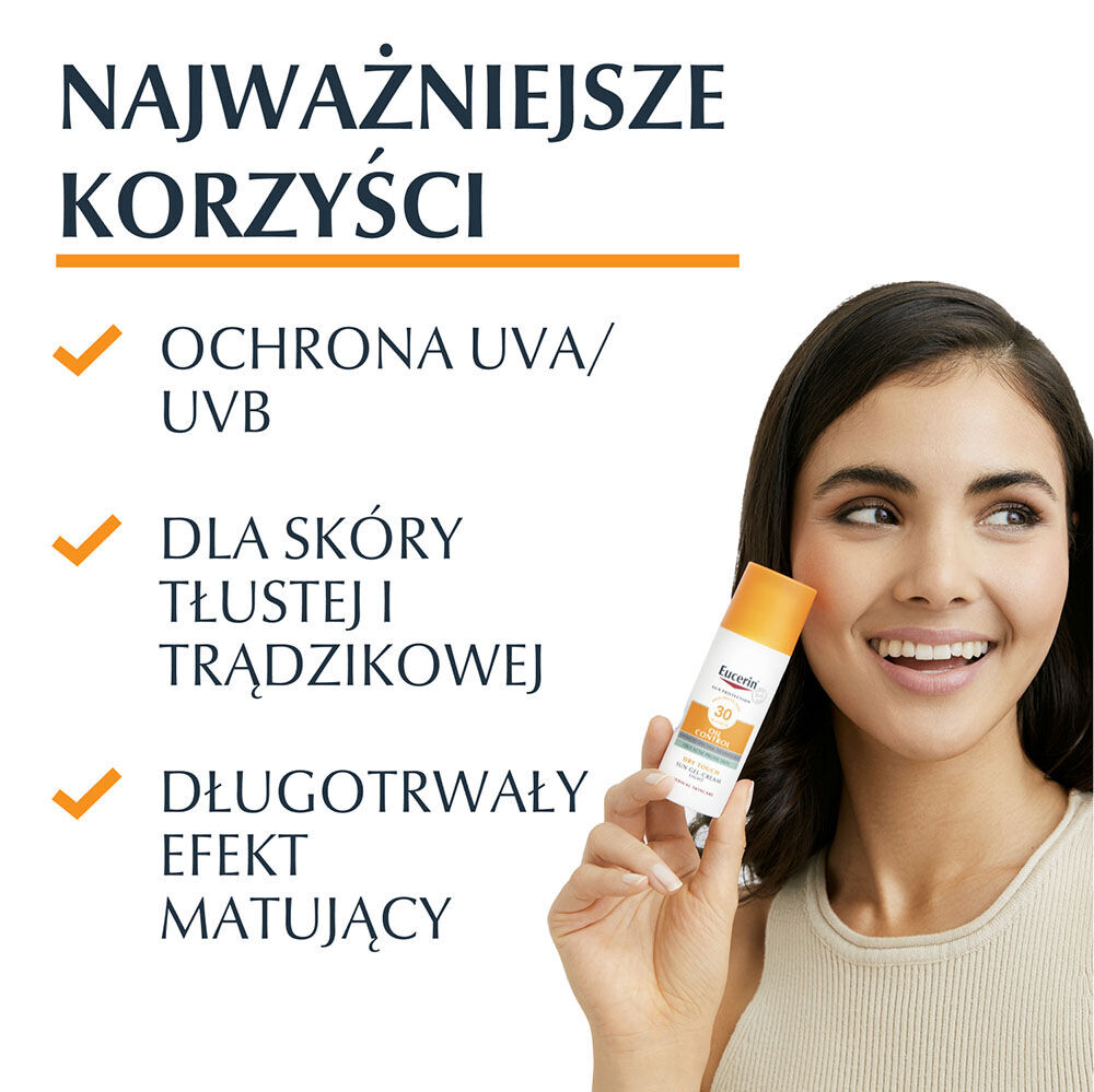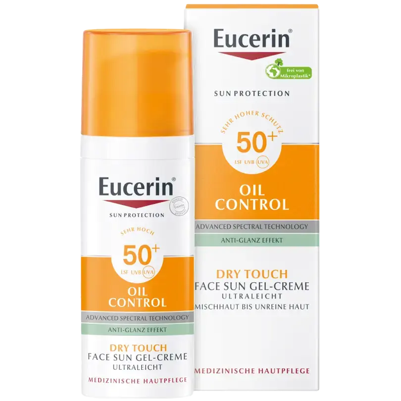 Eucerin oil control spf 50+ dry touch protective gel-cream – ультралегкое дермокосметическое средство, гарантирующее очень высокую защиту от солнца и в то же время дающее эффект матовой кожи. . специальная технология oil-control, основанная на l-карнитине и микрочастицах, поглощающих липиды, регулирует секрецию кожного сала, эффективно предотвращая появление жирного блеска кожи... преимущества использования защитного геля eucerin spf 50+:
