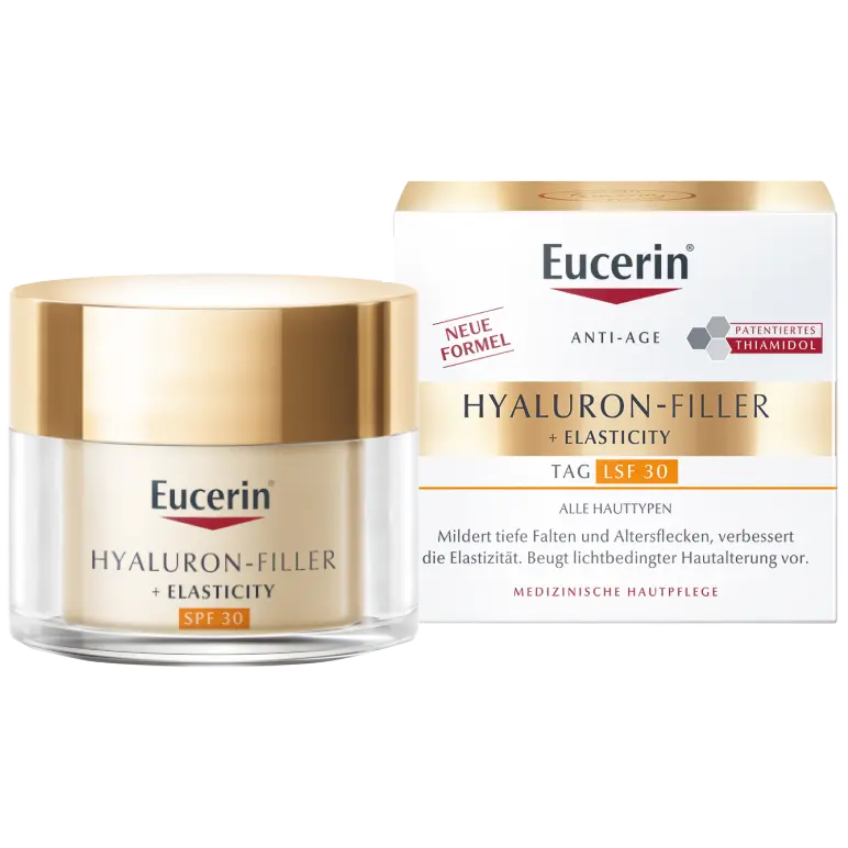 Eucerin hyaluron-filler + elasticity for the day spf 30 – идеальное решение для зрелой кожи, которая нуждается в укреплении и уходе за глубокими морщинами, которые развиваются с возрастом. использование крема способствует разглаживанию кожи и дает эффект сияющего цвета лица без изменения цвета.уникальная формула крема для лица содержит: галуроновая кислота с короткой и длинной цепью, которая помогает уменьшить морщины. запатентованный тиамидол, который уменьшает пигментные пятна и предотвращает образование новых. эффект уменьшения обесцвечивания можно наблюдать уже через 2 недели после начала использования. . он содержит биокомплекс, представляющий собой комбинацию арктиина и креатина, которые стимулируют кожу вырабатывать коллаген, тем самым укрепляя кожу и повышая ее эластичность.