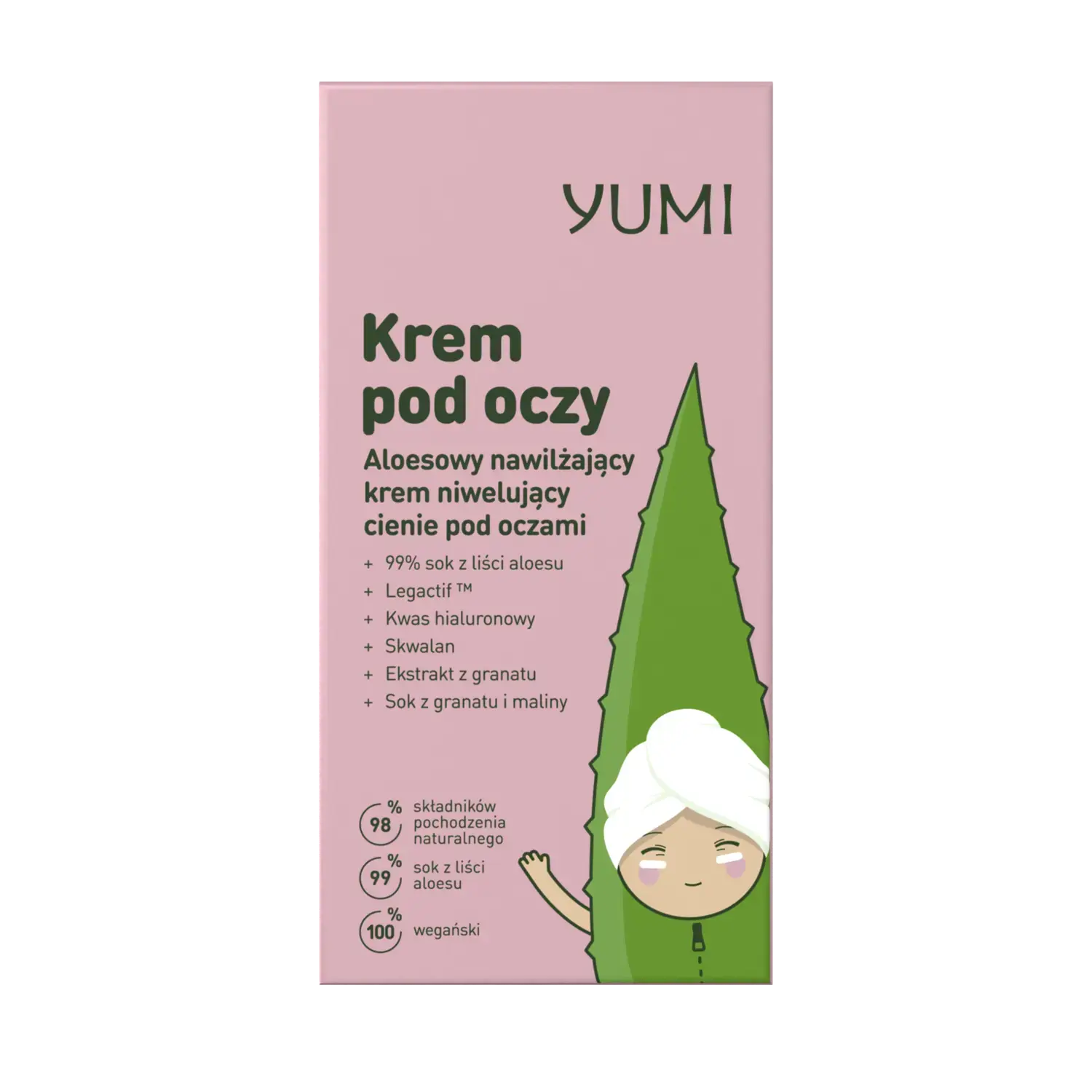 Yumi aloe eye cream увлажняющий крем, устраняющий темные круги под глазами. передавайте привет красивым глазам! с юми уход за зоной под глазами станет настоящим фруктовым праздником! легкий крем с алоэ идеально подходит для ежедневного ухода. кожа под глазами очень нежная и тонкая, поэтому крайне важно, что вы наносите на нее. крем юми увлажняет, устраняет темные круги и питает кожу. благодаря регулярному использованию вы забудете ощущение тяжести в глазах, лишенных сна! 100% веганский 99% ингредиенты натурального происхождения 99% сок листьев алоэ помимо основы алоэ крем юми содержит: гиалуроновую кислоту, экстракт граната, сок граната и малины, сквалан и легактиф. легактиф – активное вещество растительного происхождения (в том числе лимона), уменьшающее отечность и отечность. не забывайте наносить его правильно, на расстоянии примерно 1 мм от линии роста ресниц, используйте утром и вечером.