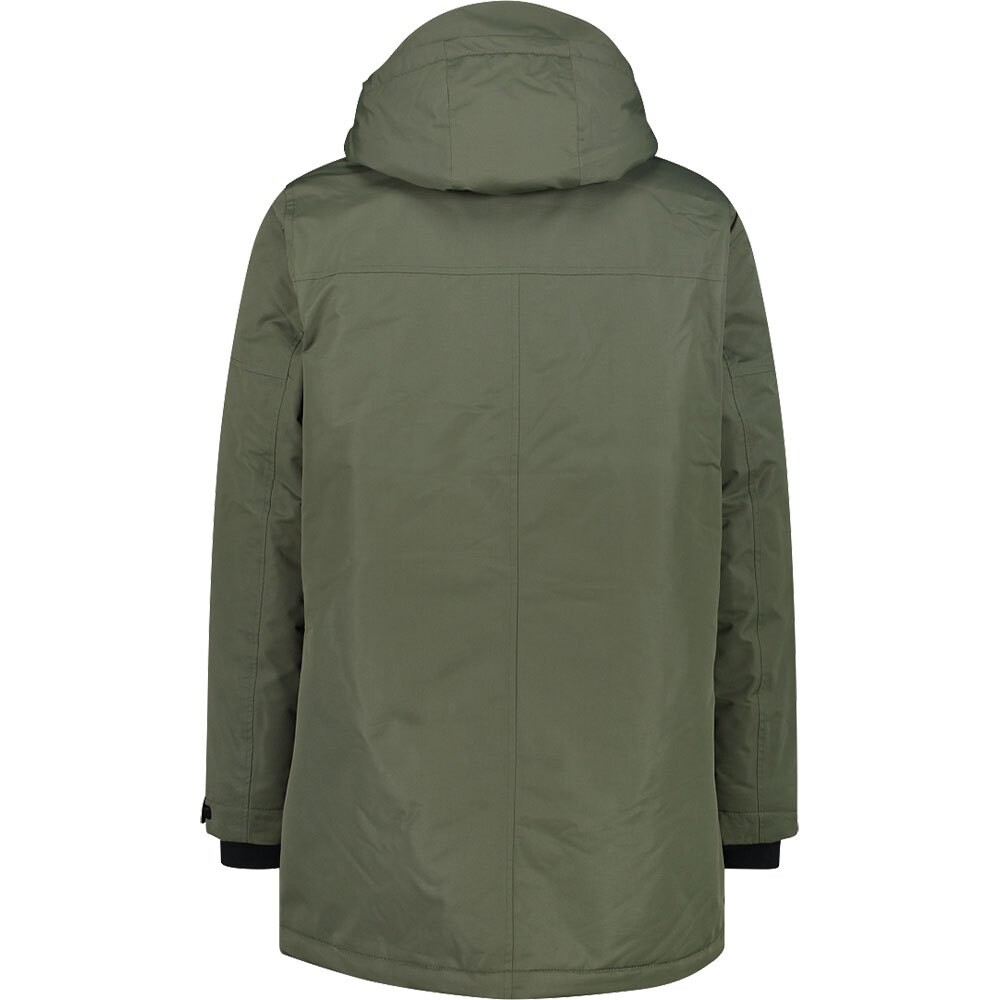 Модель с передней молнией, ветронепроницаемой и противоизтирающейся планкой, съемным капюшоном, внутренней манжетой и высоким воротником.