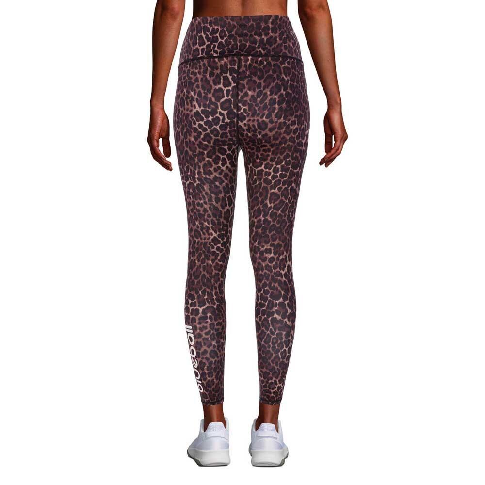 Леопардовые колготки. Женщина бегает в леггинсах. Высокие технологии с большой гибкостью, мягкостью и максимальной воздухопроницаемостью. Мягкость на ощупь и максимальная воздухопроницаемость, позволяющая быстро впитывать и испарять влагу, сохраняя сухость и свежесть. Полная длина. облегающий крой