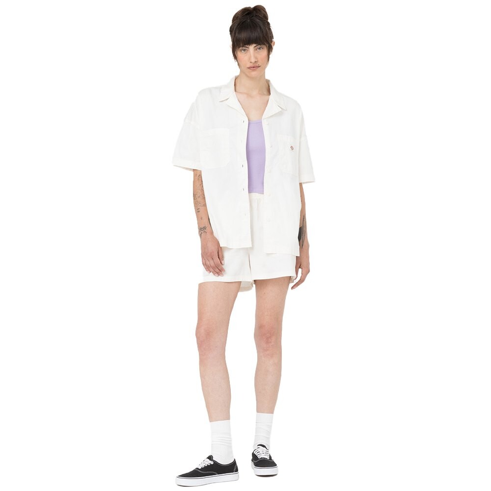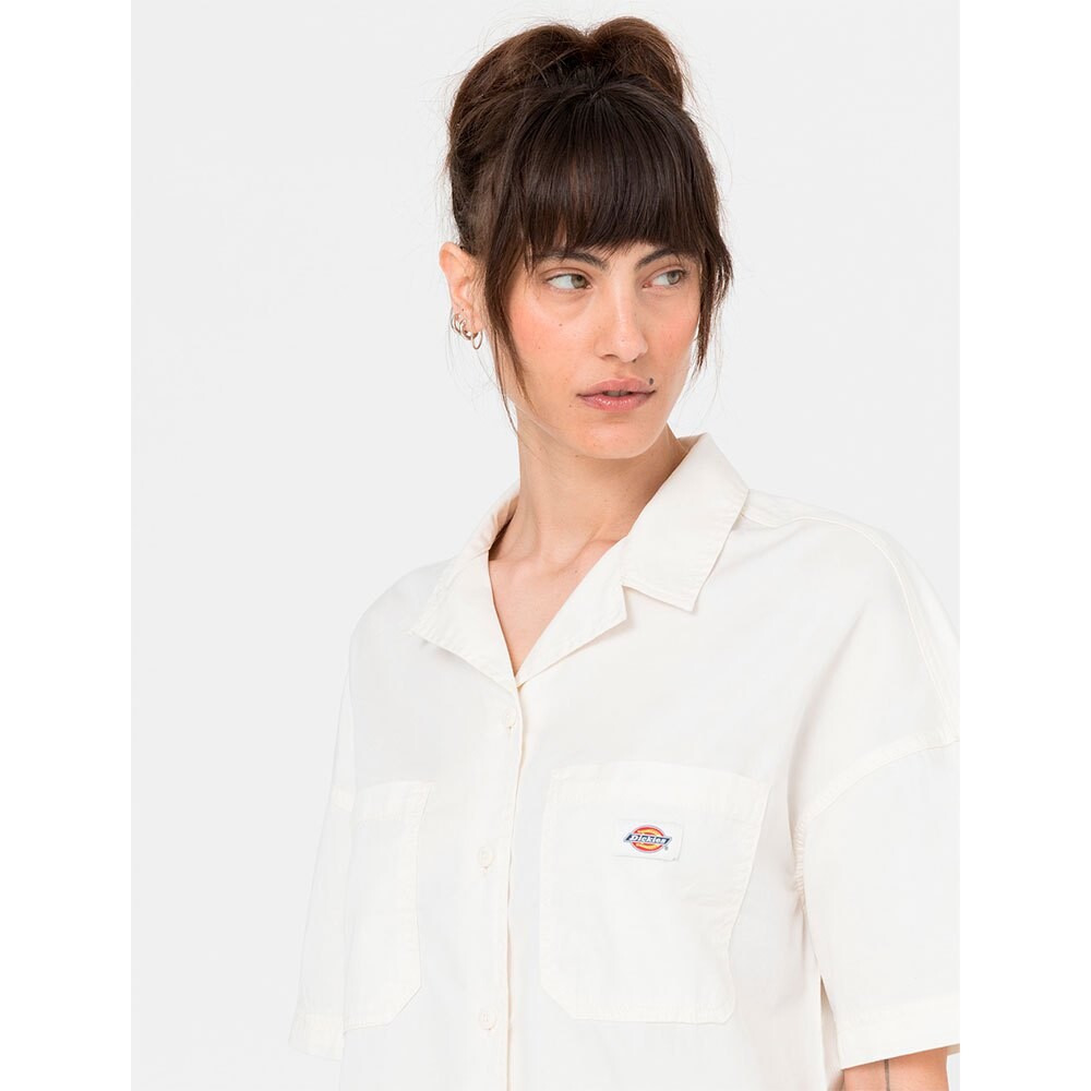 Изящная рубашка оверсайз с короткими рукавами, заниженными плечами, V-образным воротником, двойными передними карманами со вставкой для ручек и культовой тканой этикеткой Dickies, предлагаемой в этом сезоне в цветах Deep Lake и Cloud.