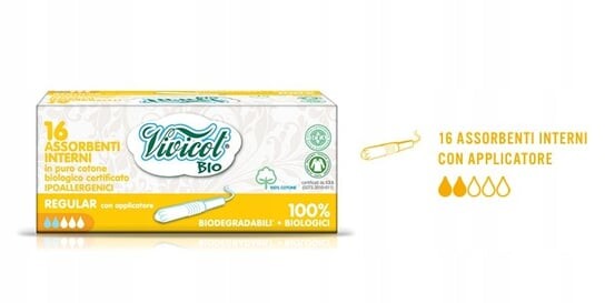 VIVICOT БИОГИГИЕНИЧЕСКИЕ ТАМпонЫ ОБЫЧНЫЕ С АППЛИКАТОРОМ, КОМПОСТИРУЕМЫЕ, НЕОТБЕЛЕННЫЕ ХЛОРОМ, ОРГАНИЧЕСКИЙ ХЛОПОК 16 ШТ.