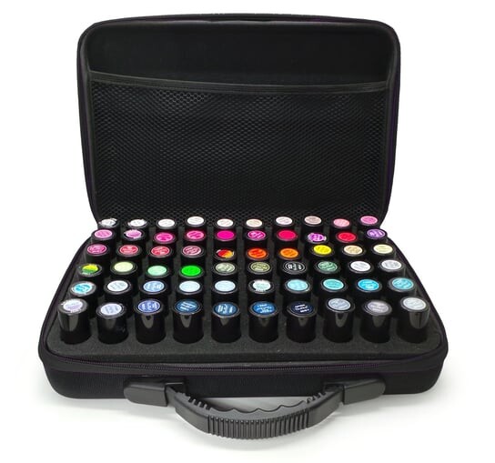 Оснащен съемной губкой, оснащенной 60 круглыми отверстиями диаметром около 2,5 см - Perfect отлично подойдет для хранения гибридных лаков, например марки NeoNail (на фото) или эфирных масел емкостью 5 мл, 10 мл и 15 мл.