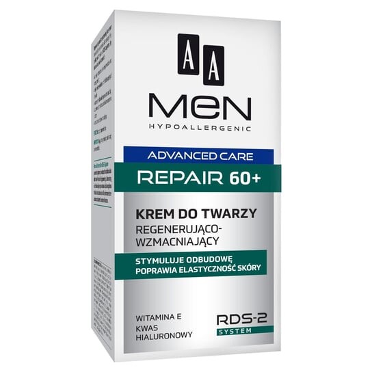 Регенерирующий и укрепляющий крем для лица AA Men Advanced Care Repair 60+ создан для укрепления мужской кожи. Гипоаллергенная формула с системой RDS-2, гиалуроновой кислотой, витамином Е: