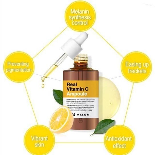 Сыворотка в виде ампулы с витамином С с осветляющим эффектом Сыворотка для лица Mizon Real Vitamin C Ampule содержит 19% чистого витамина С. Сыворотка заботится о здоровье кожи, освежает ее, осветляет пигментные пятна. , увлажняет и содержит большое количество антиоксидантов, повышающих сопротивляемость кожи. Он содержит только самые чистые ингредиенты и дерматологически протестирован. Специальная безводная формула делает сыворотку максимально эффективной, предотвращая окисление витамина С. Основные активные ингредиенты Витамин С. Высокая концентрация витамина С – 19% – оказывает выраженное антиоксидантное действие, эффективно защищает кожу от повреждения ультрафиолетовым излучением, инициирует выработку витамина С. собственного коллагена, способствует повышению эластичности, упругости и увлажненности кожи, помогает замедлить процесс гликирования и адгезии глюкозы коллагеновых волокон, что приводит к раннему старению кожи, уменьшает пигментацию и акне, выравнивает тон кожи и придает коже здоровое сияние.