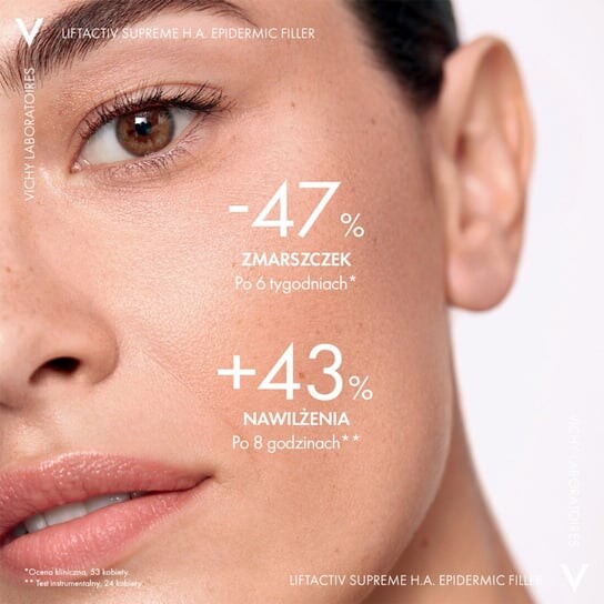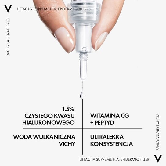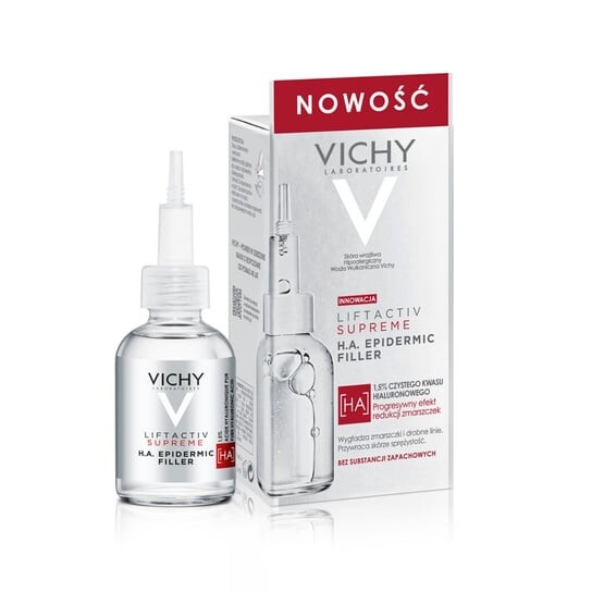 VICHY LIFTACTIV SUPREME H.A. Epidermic Filler концентрированная сыворотка против морщин с высокой концентрацией 1,5% гиалуроновой кислоты. Это наша первая сыворотка, предназначенная как для лица, так и для нежной кожи вокруг глаз. С возрастом кожа теряет больше гиалуроновой кислоты, чем производит, а негативные факторы окружающей среды, называемые экспосомами, ускоряют ее деградацию. В результате появляются тонкие линии и морщины, а кожа теряет эластичность. Благодаря синергии активных ингредиентов, признанной в дерматологии и эстетической медицине, сыворотка восполняет 100% ежедневных потерь гиалуроновой кислоты в эпидермисе. Уникальная формула содержит до 1,5% гиалуроновой кислоты: 1% низкомолекулярной гиалуроновой кислоты для уменьшения тонких линий и морщин и 0,5% высокомолекулярной гиалуроновой кислоты для разглаживания кожи. Сыворотка обогащена антиоксидантом витамином Cg, пептидом против морщин и укрепляющей вулканической водой Виши. Минималистичная формула содержит всего 13 ингредиентов, без ароматизаторов и этилового спирта. Сразу после использования сыворотки Liftactiv Supreme H.A. Эпидермический филлер восстанавливает эластичность кожи и интенсивно и продолжительно увлажняет ее. Прогрессивная эффективность в уменьшении морщин подтверждена в ходе клинического исследования*: через 6 недель морщины сокращаются на 47%, а тонкие — на 60%.