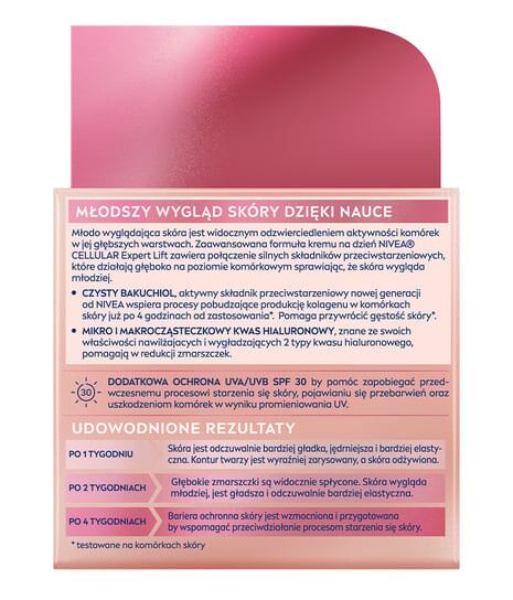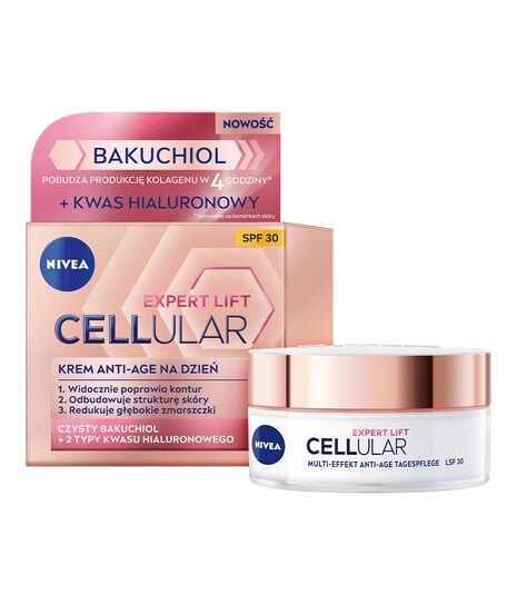 Дневной антивозрастной крем NIVEA Cellular Expert Lift SPF 30 заметно улучшает контур лица благодаря сочетанию мощных антивозрастных ингредиентов нового поколения от NIVEA. Pure Bakuchiol, антивозрастной активный ингредиент нового поколения от NIVEA, поддерживает процессы, стимулирующие выработку коллагена в клетках, уже через 4 часа после применения*. Помогает восстановить плотность кожи. Микро- и макромолекулярная гиалуроновая кислота, известная своими увлажняющими и разглаживающими свойствами, помогает уменьшить морщины.