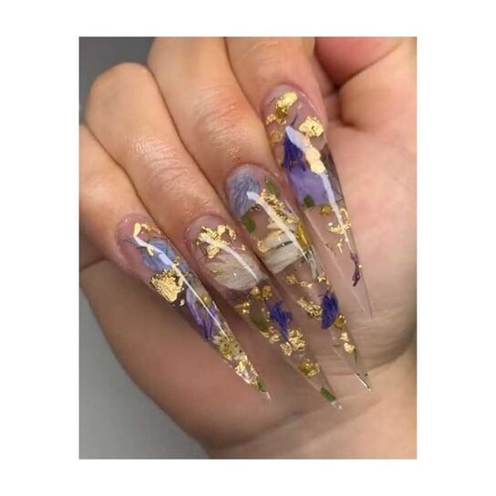 Средство следует наносить кончиком пальца, щупом или кистью; в зависимости от эффекта, которого мы хотим добиться. Лучше всего использовать дисперсию гибрида/гель-лака. Однако, если вы поклонник классических лаков для ногтей – подождите, пока лак полностью высохнет, и нанесите хлопья на клей из трансферной фольги. Помните, что независимо от того, какой способ укладки ногтей вы выберете, необходимо покрыть все это верхним слоем для гибридных лаков, например, моллилаком Doctor Top или классическим моллилаком с бриллиантовым топом.