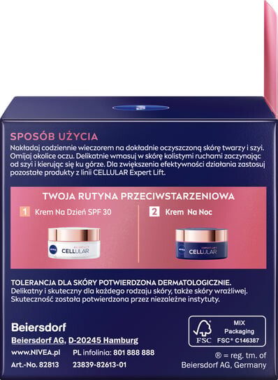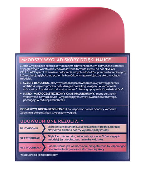 Ночной крем NIVEA Cellular Expert Lift Anti-Age содержит комбинацию мощных антивозрастных ингредиентов, которые действуют глубоко на клеточном уровне, благодаря чему кожа выглядит моложе. Pure Bakuchiol, антивозрастной активный ингредиент нового поколения от NIVEA, поддерживает процессы, стимулирующие выработку коллагена в клетках, уже через 4 часа после применения*. Помогает восстановить плотность кожи. Микро- и макромолекулярная гиалуроновая кислота, два типа гиалуроновой кислоты, известные своими увлажняющими и разглаживающими свойствами, помогают уменьшить морщины.