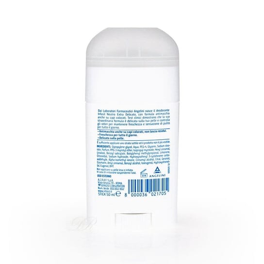 Итальянский дезодорант Infasil в стике был признан фармацевтическими лабораториями Анджелини как нейтральный и очень деликатный препарат со специальной формулой, устойчивой к образованию пятен на цветной одежде. Клинические исследования показывают, что благодаря своей уникальной формуле он не оставляет следов и эффективно противодействует неприятным запахам.