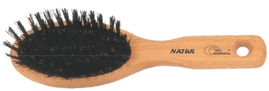 Маленькая, овальная расческа. Изделие изготовлено из натурального дерева. Контурная ручка идеально повторяет форму руки. Обеспечивает удобство и комфорт во время использования. Поверхность расчесывания имеет плотные, слегка гибкие пучки щетинок различной длины. Они изготовлены из натуральной кабаньей шерсти, помещенной на черную пневмоподушку. Позволяет аккуратно расчесывать короткие волосы. Изделие изготовлено с большой тщательностью и вниманием к деталям, благодаря чему его можно использовать в течение длительного времени. На ручке имеется логотип и название производителя.