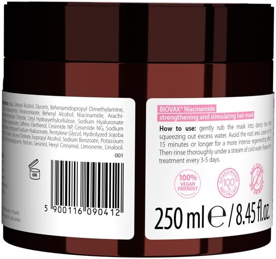 Маска L'biotica® Biovax Ниацинамид является элементом трихологическое укрепляющее и стимулирующее средство, предназначенное для ослабленных волос и чувствительной кожи головы.