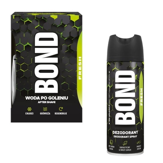 Bond Fresh Aftershave 100ML — охлаждающая формула средства после бритья Bond.Fresh эффективно увлажняет кожу и дарит ощущение нежной свежести. Успокаивает раздражение, вызванное ежедневным бритьем. Энергичный, свежий древесно-цитрусовый аромат сочетает в себе повседневную элегантность со спортивной непринужденностью. Bond Fresh Deodorant Spray Men 150ML - Дезодорант для тела Bond Fresh эффективно устраняет неприятный запах пота. Освежающая нота аромата обеспечивает ощущение комфорта и оставляет на теле мужественный аромат в течение всего дня.Как пользоваться средствами из набора Bond Fresh?
