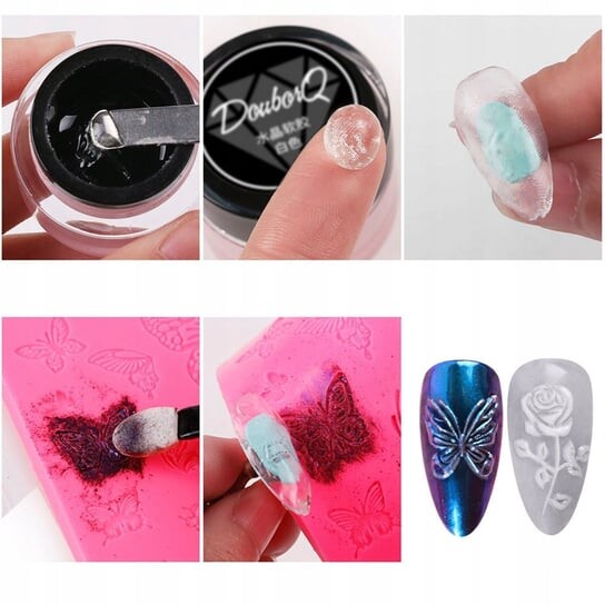 2. Насыпьте пыль на силиконовую форму, например, хамелеон, хром, единорог или стекло, и тщательно вотрите ее в форму с помощью марионетки.