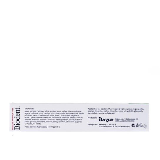 • эффективность Biodent Зубная паста основана на действии специальной комбинации экстрактов 5-ти лекарственных трав: ромашки, шалфея, мелиссы, розмарина и гамамелиса и аллантоина