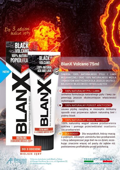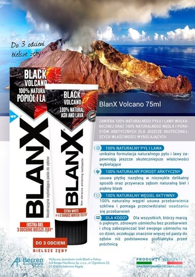 - Благодаря очищающим и абсорбирующим свойствам 100% натурального пепла, лавы и угля BlanX® Black Volcano обладает сильным отбеливающим эффектом без абразивного эффекта.