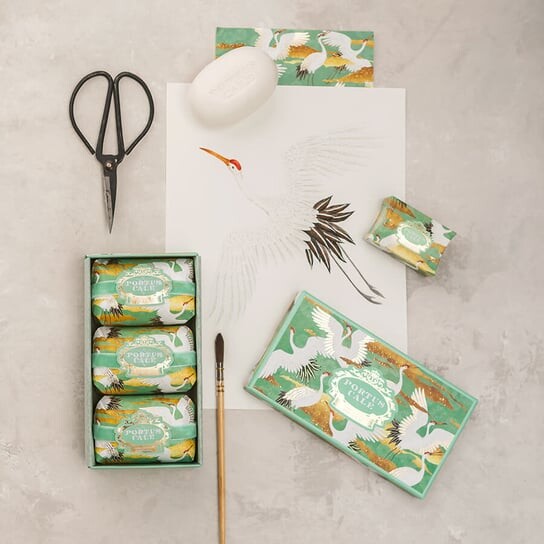 Набор из 3-х ароматных мыл Portus Cale "Белый журавль" в подарок любимым или ваш дом. Каждое мыло штампуется вручную и вручную заворачивается португальскими мастерами в декоративную бумагу. Мыло изготовлено на 100% на растительной основе и пахнет сочетанием свежих цитрусовых юзу и зеленых нот ветивера, подчеркнутых сочным оттенком мандарина, который освежает разум и тело. Все это упаковано в роскошную коробку, которую можно повторно использовать для хранения мелких предметов, таких как фотографии, швейные принадлежности и другие мелкие предметы.