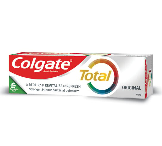 Зубная паста COLGATE TOTAL ORIGINAL борется с бактериями, присутствующими на зубах, языке, щеках и деснах, на срок до 12 часов для здоровья всей полости рта.*