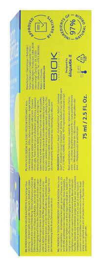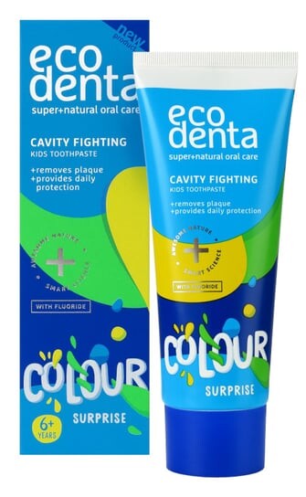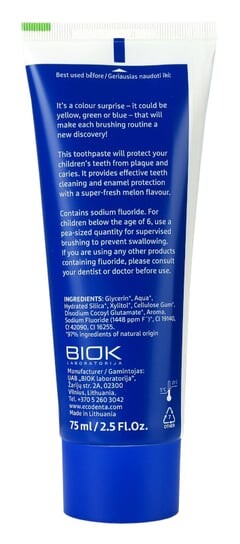 Детская зубная паста против кариеса содержит до 97% ингредиентов природного происхождения. Формула защищает зубы от образования кариеса и налета, а также имеет приятный дынный аромат благодаря добавлению ксилита. Эта паста – красочный сюрприз – она может быть желтой, синей или зеленой. Содержит фторид натрия (1448 ppm F). Для детей от 6 лет.