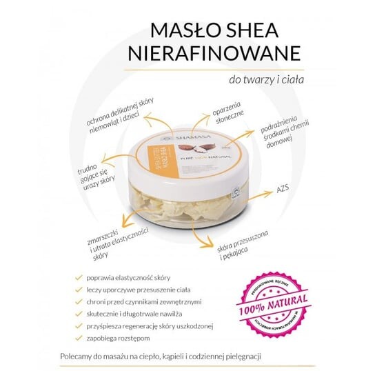 Масло Ши – уникальный продукт растительного происхождения. Он родом из Африки из плодов дерева Маслоша. По-французски это называется Карите, что означает жизнь. Он очень легко впитывается и увлажняет кожу, не закупоривая поры. Он обладает многими свойствами, которые очень полезны с точки зрения ухода за кожей. Рекомендуется преимущественно для сухой, атопической, раздраженной, зудящей, нежной и дряблой кожи. Оно очень хорошо способствует исчезновению шрамов, растяжек, ожогов и псориаза.