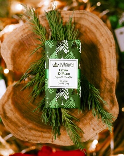 Рождественское мыло с ароматом сосны и кедра, упакованное вручную в зеленую бумагу. Все увенчано зеленой атласной лентой.