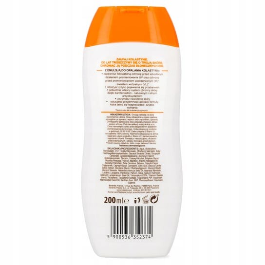 Эмульсия для загара SPF 20 КОЛАСТИНА предлагает эффективную и фотостабильную защиту от 4 основных типов излучения (UVA, UVB, видимый свет, инфракрасное излучение), которые способствуют солнечным ожогам и образованию свободных радикалов, ответственных за преждевременное старение и фотостарение кожи. Каротиноиды, содержащиеся в формуле, натуральные и сильные антиоксиданты, помогают стимулировать собственную защитную систему кожи, обеспечивают уход и защиту от фотостарения, а также здоровый и молодой вид.