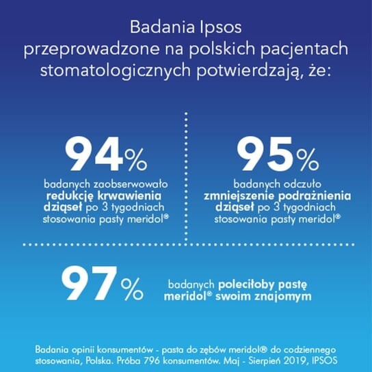 Исследования Ipsos, проведенные на польских стоматологических пациентах***, подтверждают, что 97% респондентов рекомендовали бы зубную пасту meridol своим друзьям.