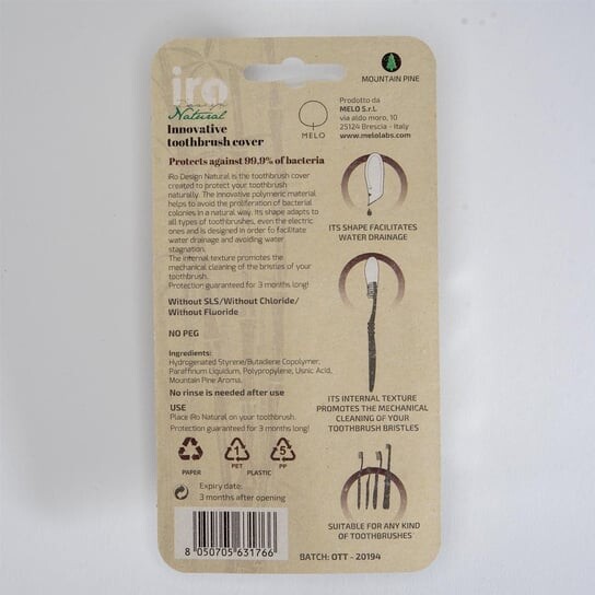 IRO — единственный чехол для зубной щетки на рынке, который обеспечивает 99,9% защиту от бактерий на волокнах щетки, и те, кто снаружи. Специально разработанные и запатентованные полимеры пропитаны антисептиком медленного действия, благодаря которому они эффективно дезинфицируют вашу зубную щетку и предотвращают развитие болезнетворных бактерий, когда вы ею не пользуетесь. IRO гарантирует полную защиту вашей зубной щетки в течение 3 месяцев. Не беспокойтесь о посадке: чехлы имеют универсальный размер и дизайн и доступны в 4 цветах, поэтому вы сможете быстро отличить свой чехол от остальных представителей семейства. Как и все продукты MELO, этот на 100% изготовлен из натуральных, полностью перерабатываемых ингредиентов.