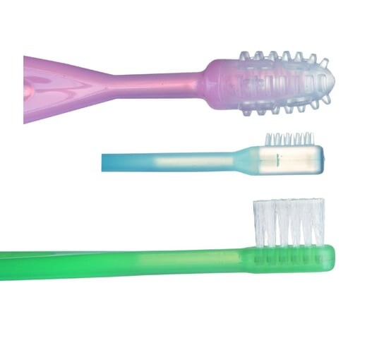 • Резиновая щетка: внешний вид традиционной зубной щетки; для детей примерно с 11-месячного возраста; резиновый наконечник для предотвращения повреждения десен и первых зубов.
